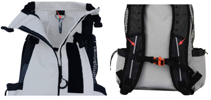 9. Система защиты— Рюкзак оснащен предохранительной застежкой, предотвращающей отсоединение, которую можно использовать вместе с ошейником собаки, чтобы обеспечить надежную фиксацию животного во время экстренного торможения. Светоотражающие полосы расположены на плечевых лямках (не покрывая всю сумку), чтобы избежать сильного светового загрязнения, отвлекающего внимание водителя, и обеспечить видимость для встречного транспорта.