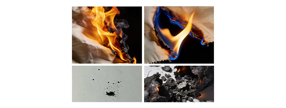 Полиэстеровая ткань: При воспламенении пламя имеет желтый цвет, и при горении оно плавится, образуя капли, сопровождающиеся характерным запахом горящего пластика. Капли остывают, превращаясь в хрупкие частицы, которые легко ломаются при сжатии. Во время горения образуется небольшое количество черного дыма, а после того, как пламя гаснет, остается небольшое количество серовато-белого пепла.