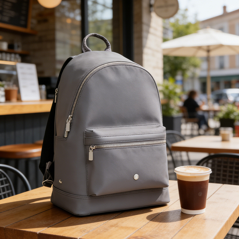 The bag's bottom is structured like a tray, giving it a well-defined shape. The back of the casual bag also features a trolley strap, allowing it to be easily slid onto a suitcase handle during travel. This backpack is ideal for brands looking to offer a personalized bag for men, blending both style and practicality.