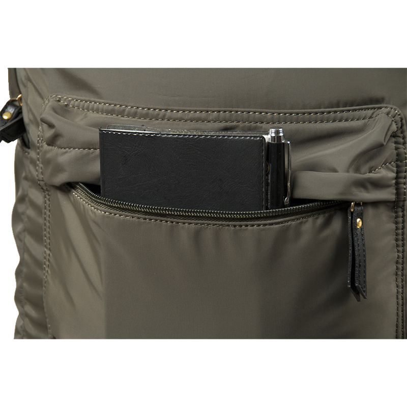 Two elastic side pockets are attached flush to the bag body, staying compact when not in use and easily accommodating a 500ml thermos when needed. The matching olive green custom zippers are high-quality and glide smoothly. We also offer custom backpacks services, supporting personalized logo customization to make each backpack unique.