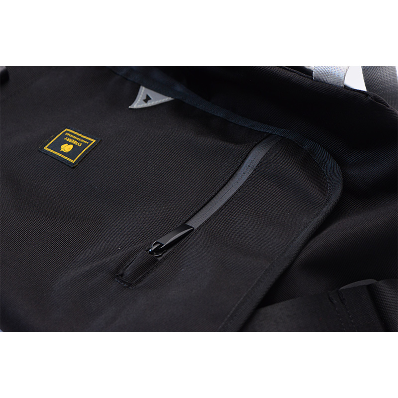 The flap features a hidden vertical zipper pocket for small essentials. The reverse-installed zipper not only improves discretion but also adds a subtle decorative touch. A black-and-gold woven brand label and distinctive buckle hardware further elevate the flap design. With dual closure using both Velcro and buckle fastening, the bag offers enhanced security while allowing adjustable height to expand overall capacity.