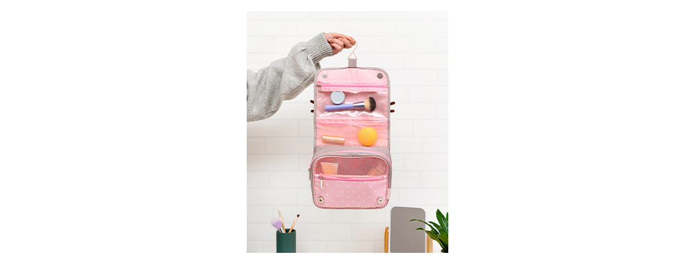 В среднем, площадь столешниц в ванных комнатах отелей составляет менее 0,5 квадратных метров. Наша подвесная конструкция косметички с вращающимся на 360° металлическим крючком превращает вертикальное пространство в организованное место для хранения.